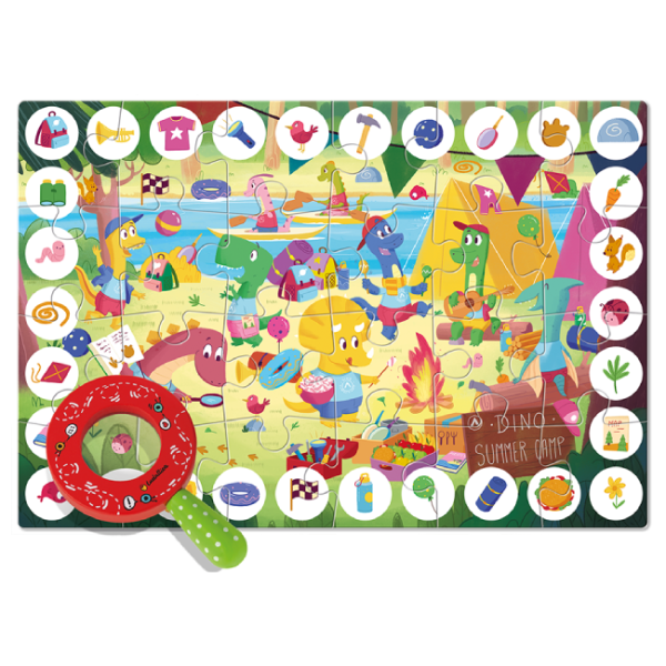 Característiques: 24 peces de cartró resistent, lupa de fusta natural, il·lustracions acolorides del món dels dinosaures. Perfecte per a nens de 3 a 8 anys.