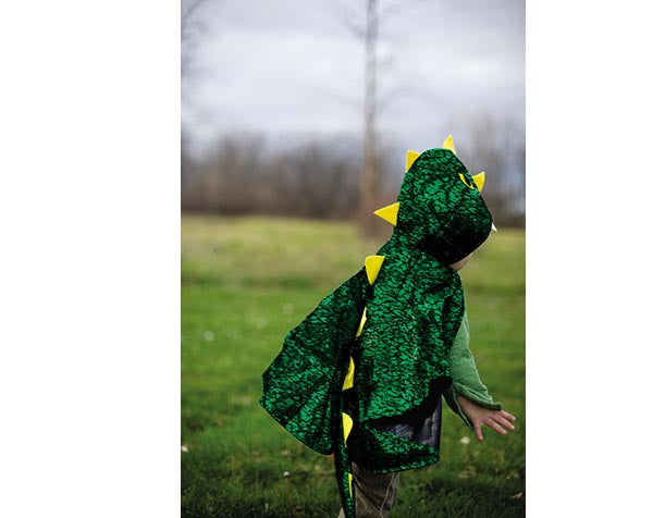 Capa verde metálica con textura de escamas y picos de fieltro reforzado que se mantienen en pie. Forro suave interior y cierre velcro fácil, perfecta para juegos feroces y criaturales.