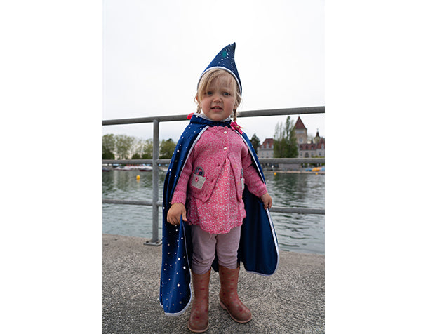 Conjunto de capa y sombrero de mago azul con estrellas plateadas que brilla en la oscuridad. Perfecto para futuros hechiceros y juegos mágicos.