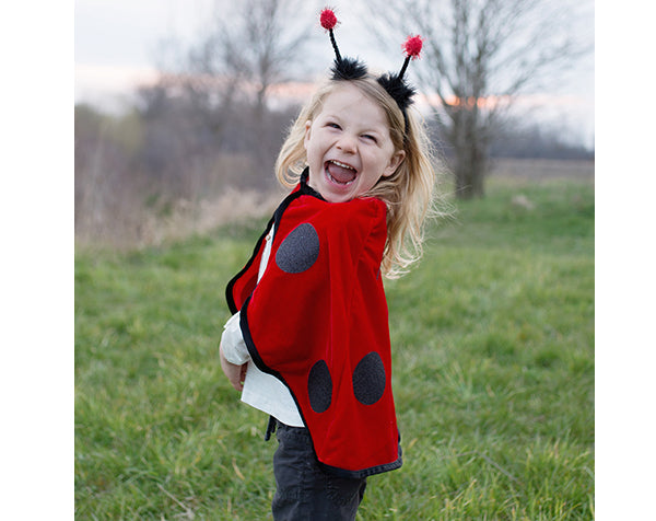 Capa roja con alas de topitos negros y capucha con antenas de pompom. Ideal para juegos de jardín y fantasía, combina con diadema incluida para completar el look.