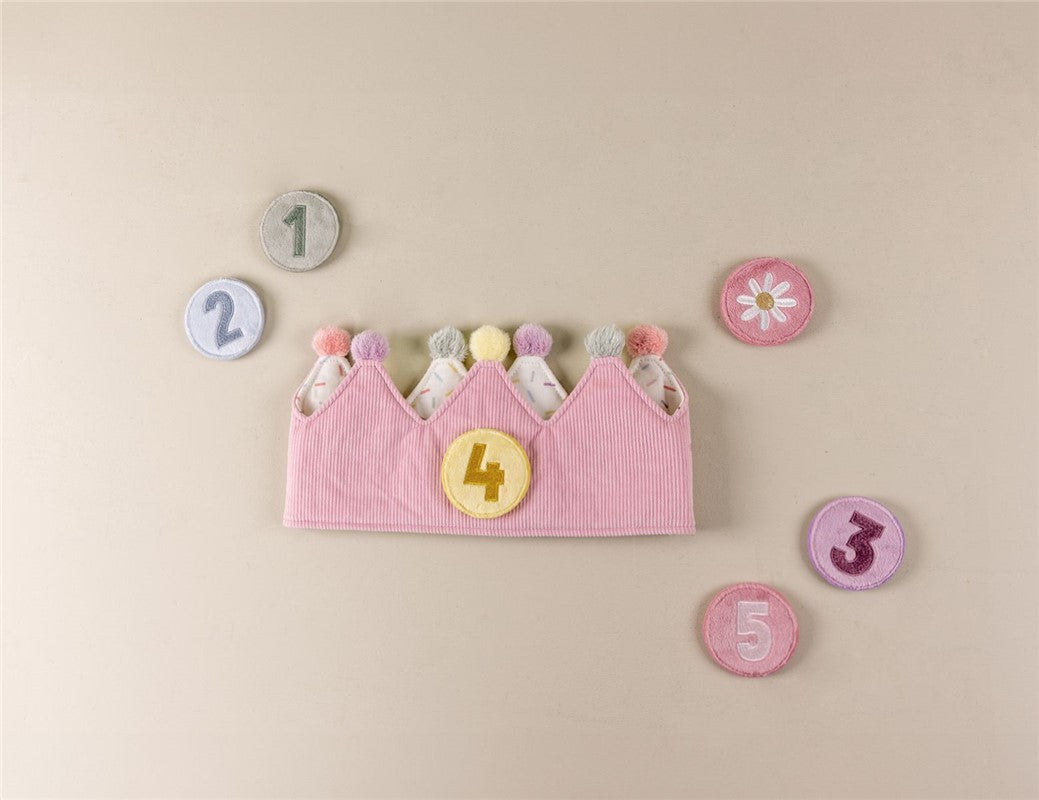 ¡Feliz cumpleaños! Celebra con estilo con esta adorable corona de cumpleaños y espolvoree un poco de magia de cuento de hadas en su día especial. Viene con números intercambiables del 1 al 5, lo que lo hace perfecto para los hitos de crecimiento de su pequeño. ¡Adjunta el número de cumpleaños a la corona y captura esos preciosos momentos! U opta por el parche de flores cuando tu pequeño quiera ser el rey o la reina del país de las maravillas. La corona está confeccionada en suave tejido acolchado y acanalado en color rosa claro rematada con pompones de colores. El cierre de velcro permite que la corona se adapte y crezca con su hijo. Observe a su pequeño usar la corona con orgullo, mostrando su edad con cada sonrisa y risita. ¡Feliz celebración!