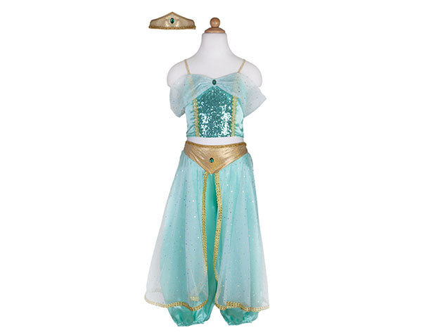 Disfraz de Jazmín en color verde azulado. Inspirado en el look de la princesa, con un diseño exótico y elegante