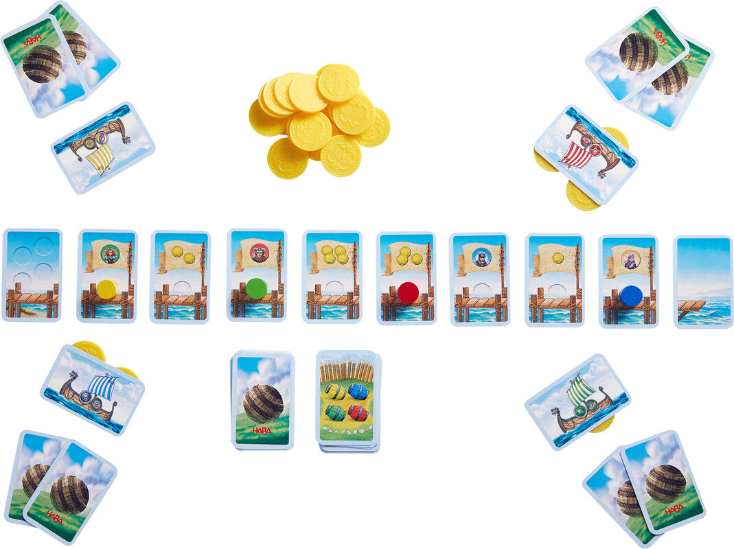 Nuevo formato de la versión mini del "Juego Infantil del Año 2019". Por turnos, los jugadores/as decidin jugar una de sus cartas de la mano o de la pila. En función de la carta mueven las fichas de colores por el embarcadero. En cuanto una de las fichas cae al agua, se reparten monedas en función de la posición que ocupan en el embarcadero. Gana quien consiga más monedas de oro. CONTENIDO: 28 cartas de toneles, 10 cartas de embarcadero, 4 cartas de barcos, 24 monedas de oro, 4 fichas y 1 instrucciones del juego. |