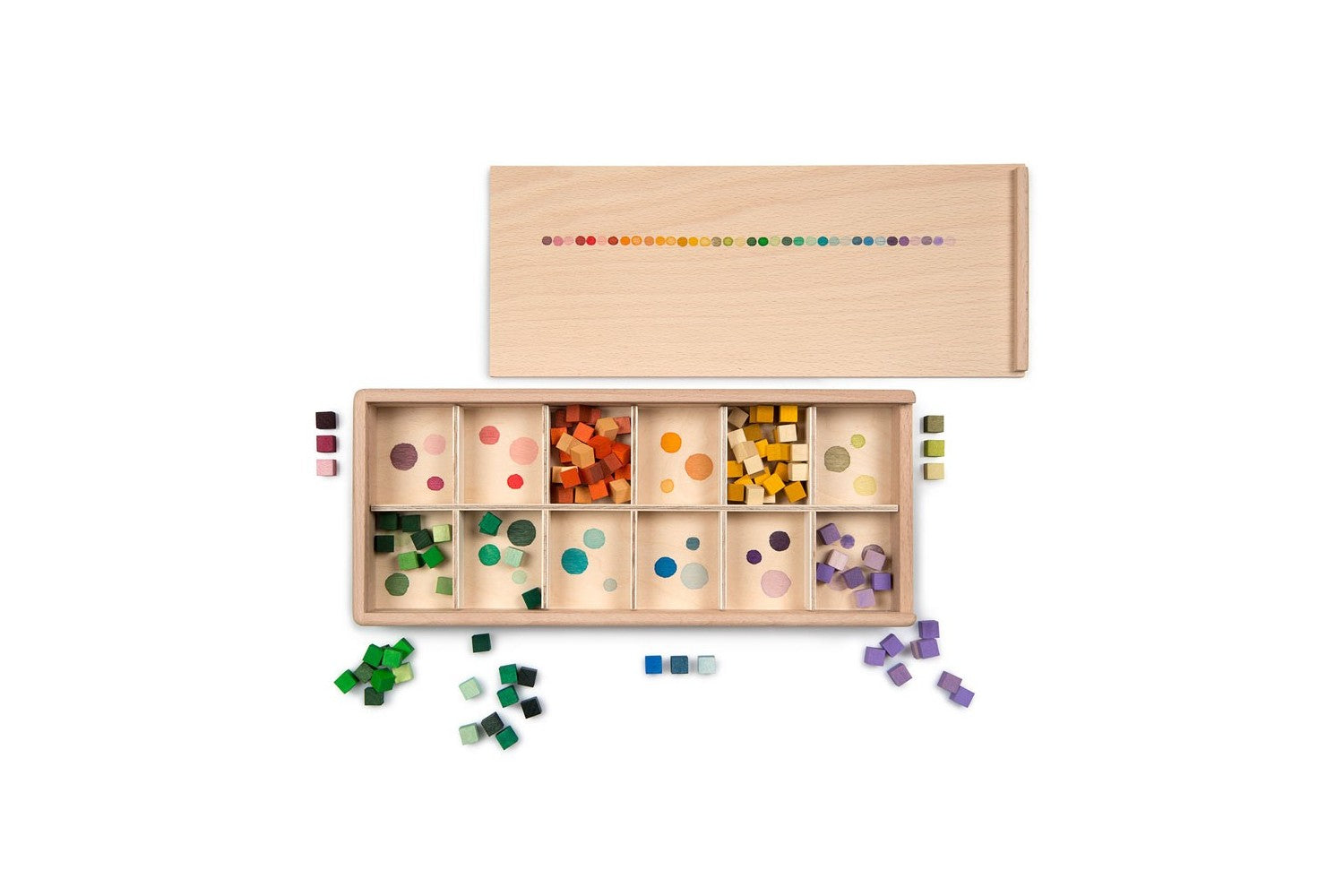 It contains a platform divided into 4 sections that determine the seasons, printed with the months of the year, 1 bowl and two natural wood cubes.