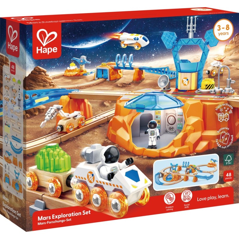 El Set Ferroviario Exploraciones en Marte combina la fascinación por los trenes con la aventura espacial, creando un universo de juego donde la imaginación no tiene límites. Incluye figuras de astronautas, vías modulares y un tren espacial con alas plegables junto a vehículos de exploración. Fabricado con materiales sostenibles de primera calidad, este conjunto desarrolla habilidades de resolución de problemas y pensamiento espacial mientras estimula la curiosidad científica. Perfecto para jóvenes exploradores que desean construir sus propias misiones interplanetarias y descubrir nuevos mundos a través del juego creativo.